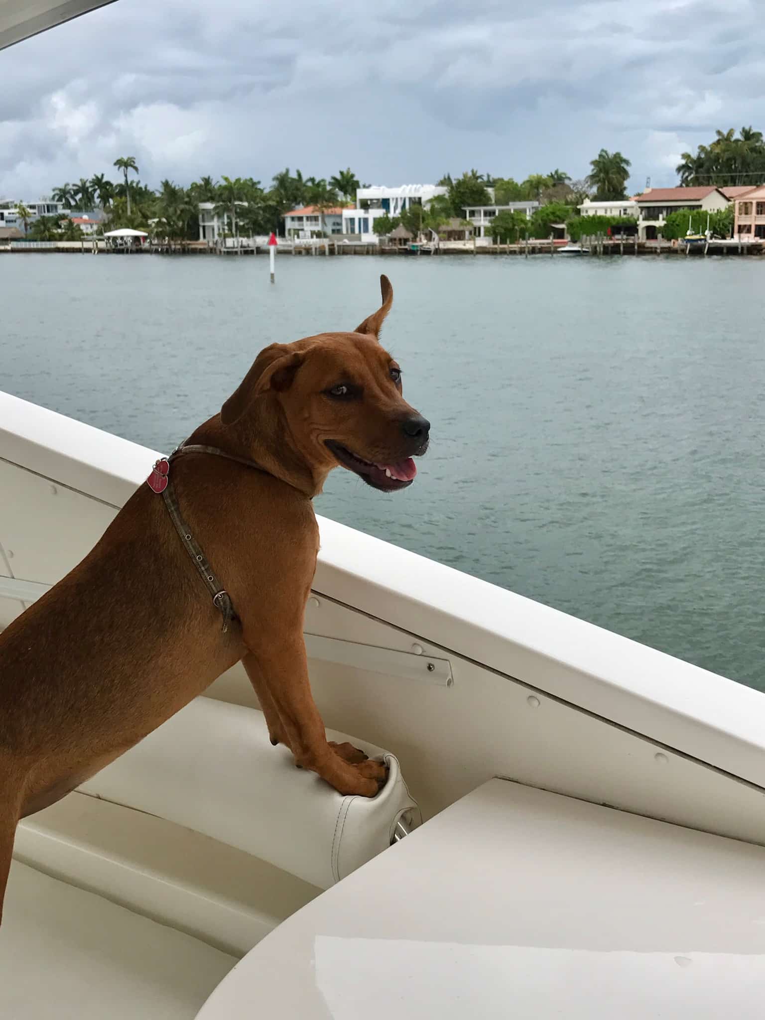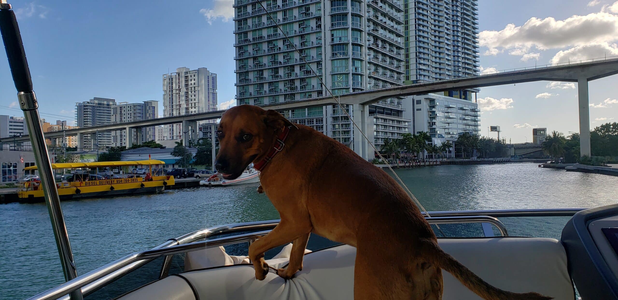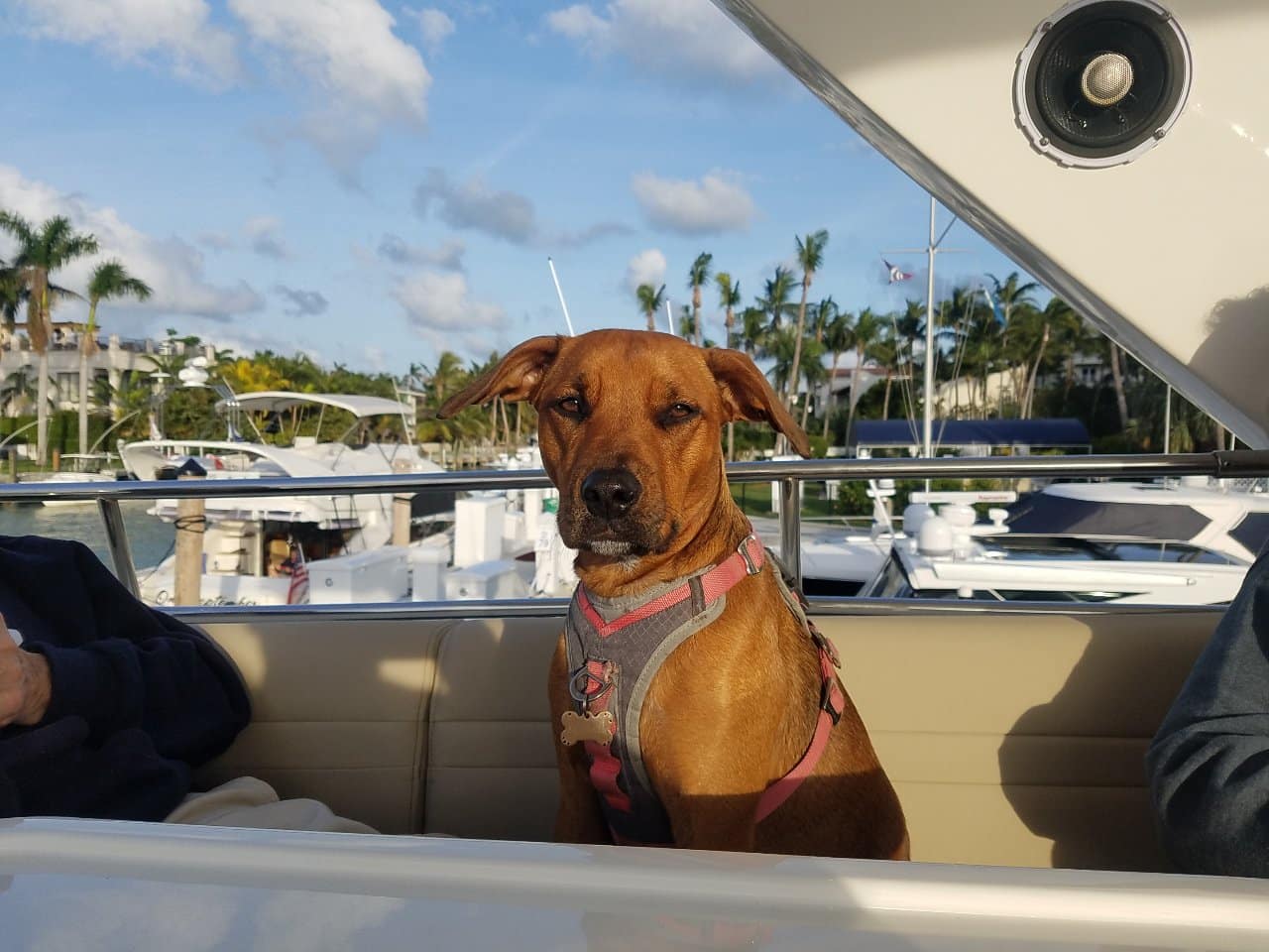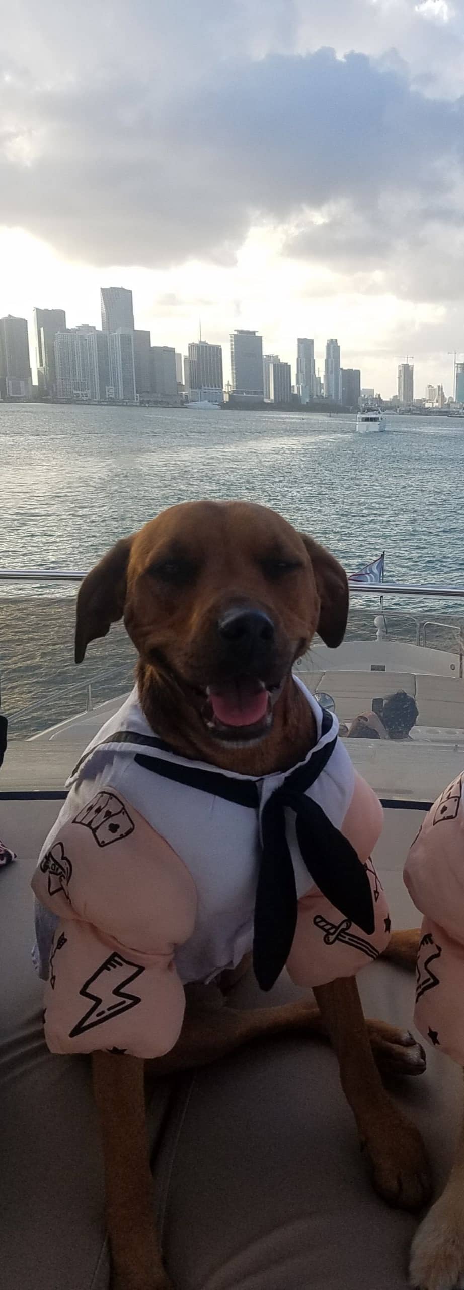 Squirrel was rescued from Miami Animal Control at the tender age of 6 weeks old , she was going to be put down as she was “sick as a dog” She has been happy and healthy since the day she came home. Squirrel comes to work every day and loves meeting people, she loves to give kisses and jump on boats. She has met city officials, clients, and even celebrities. She is definitely a boat dog! Come meet her as she greets every guest!