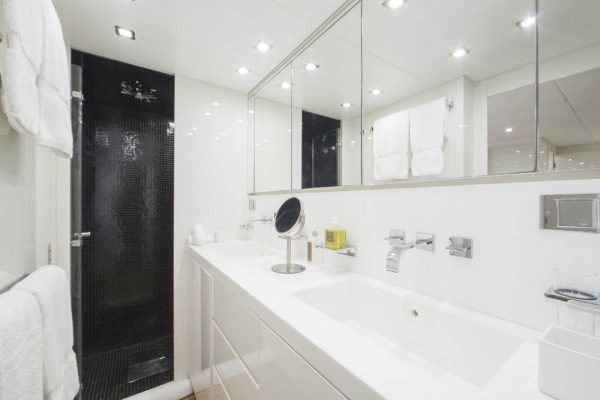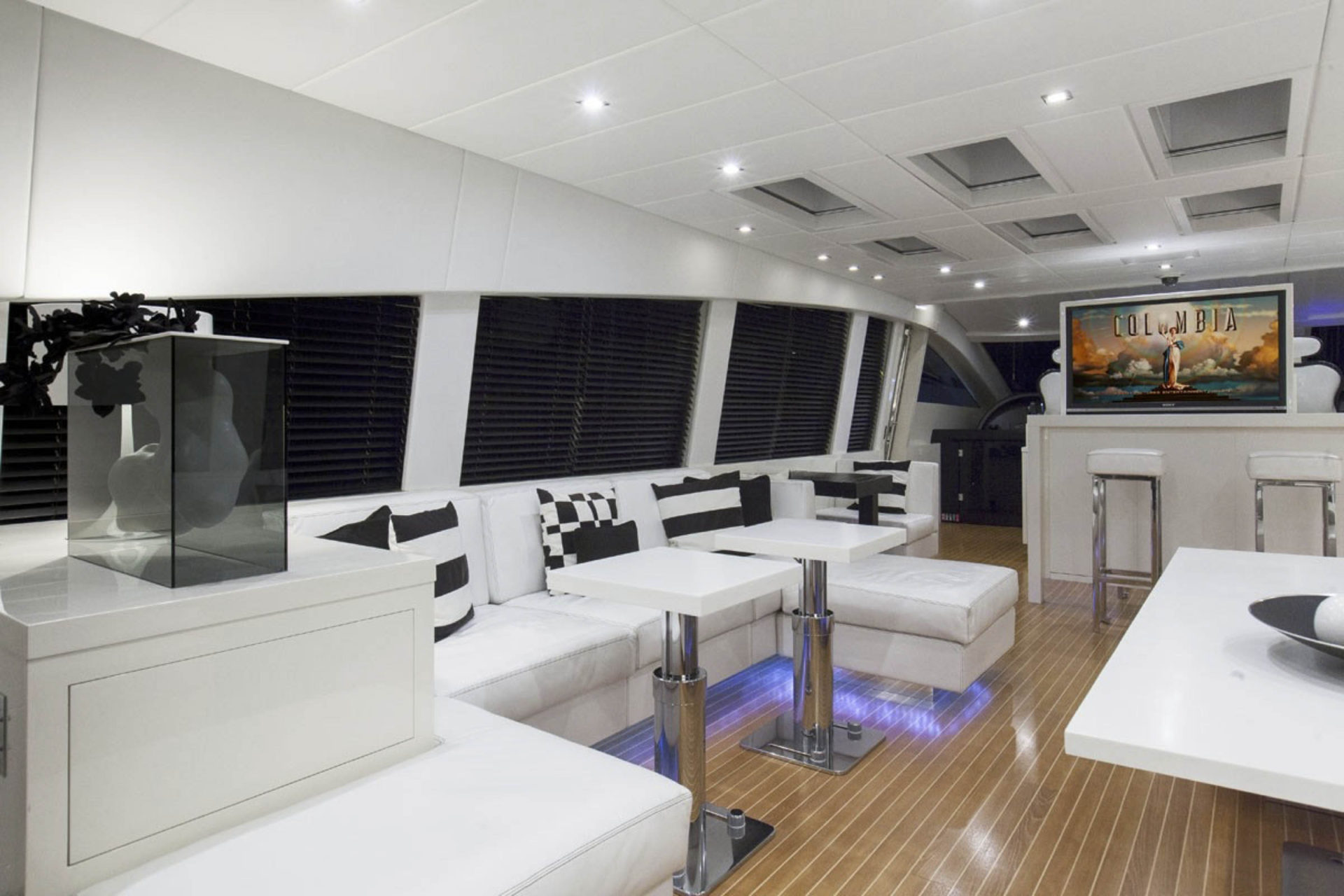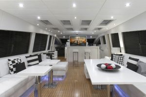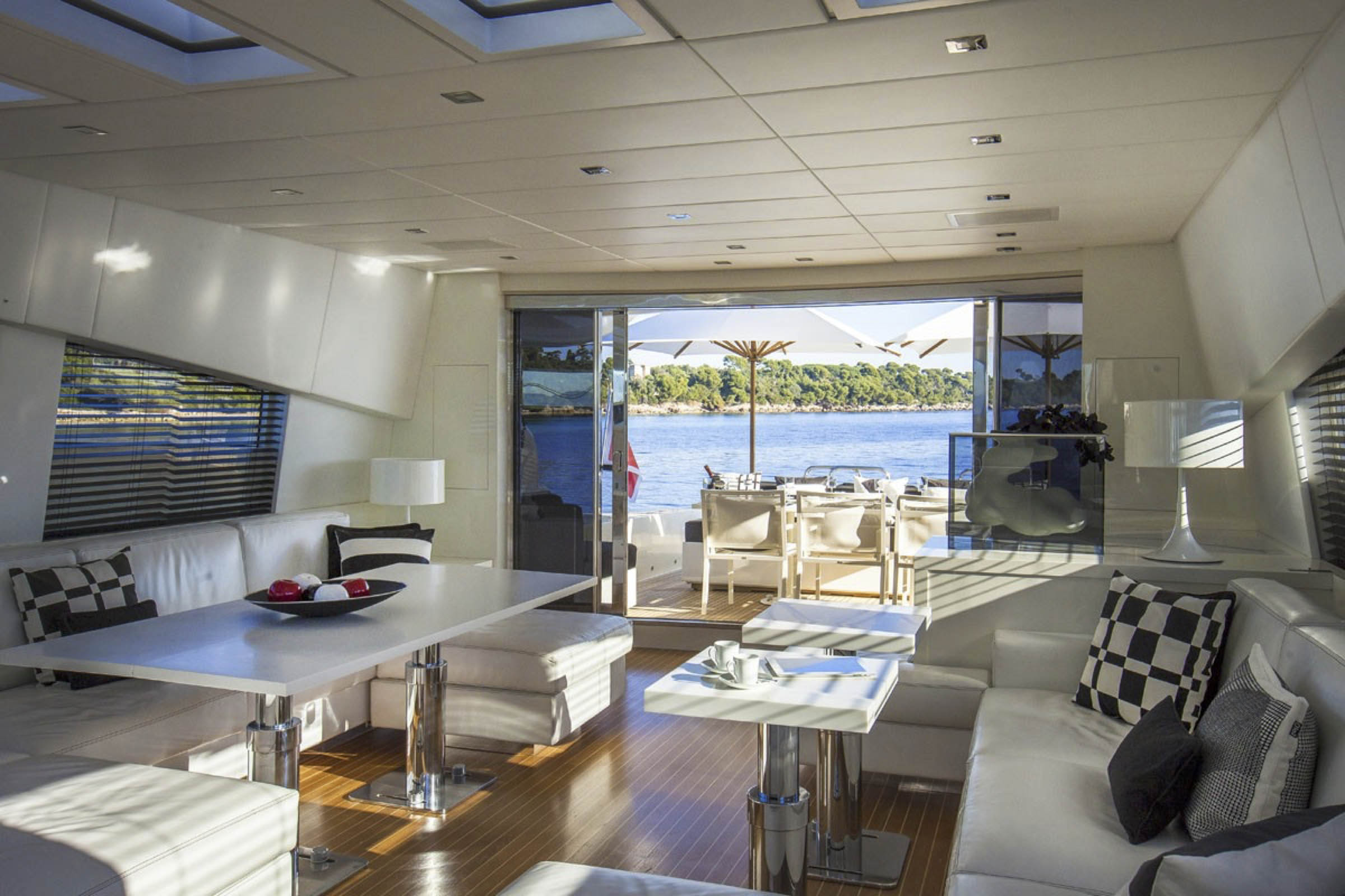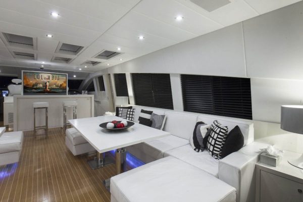 FRIDAY’s main salon has large white couches to port and starboard providing comfortable lounging for all guests onboard. There is a dining table for formal dining indoors to starboard and twin coffee tables to port. There is an entertainment system and a bar forward.