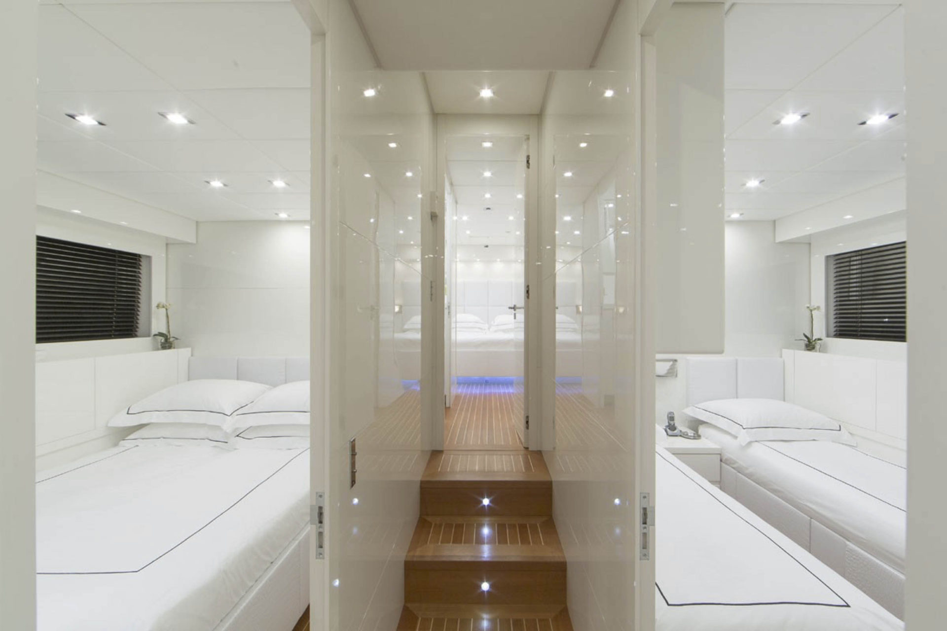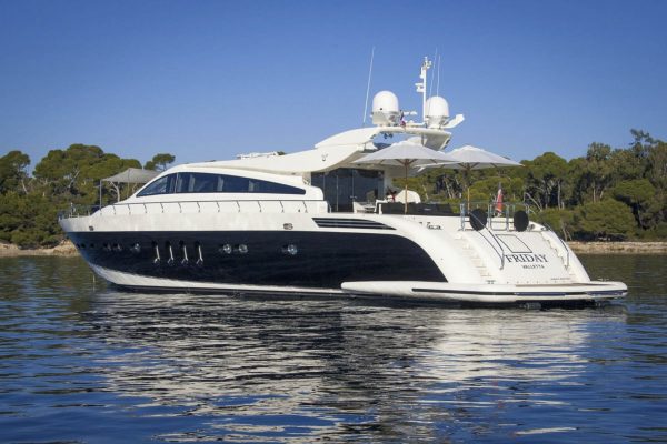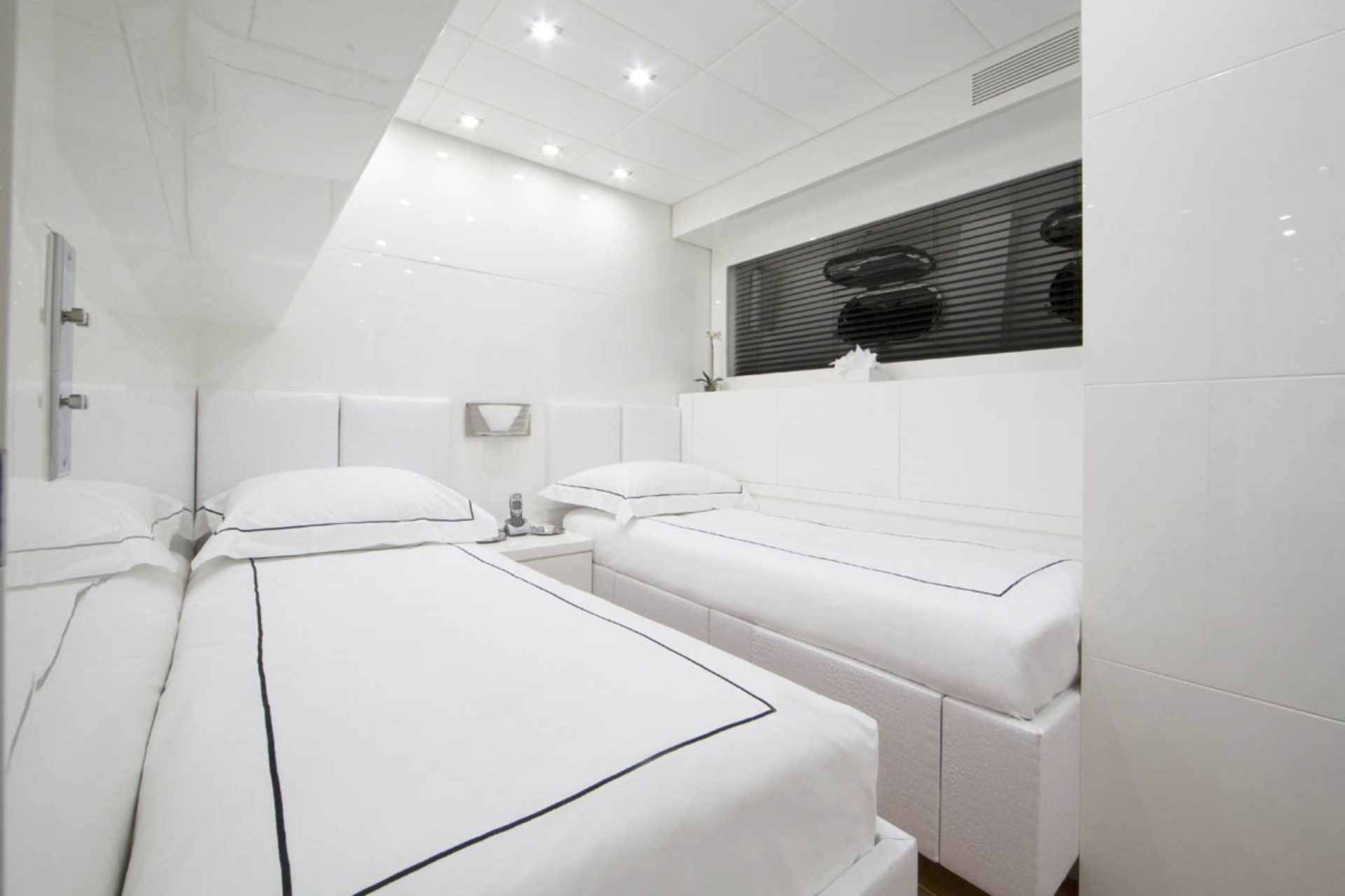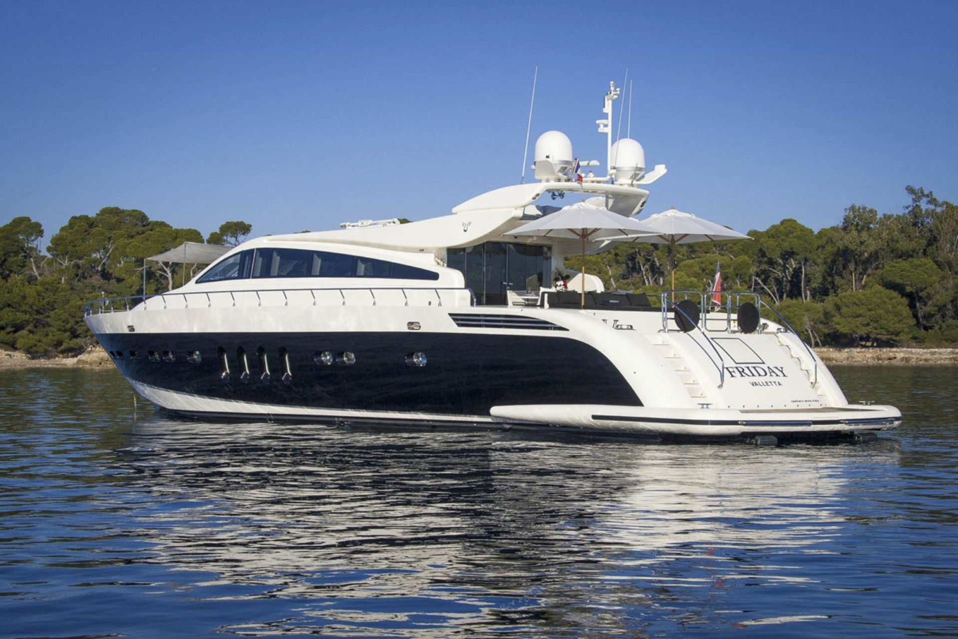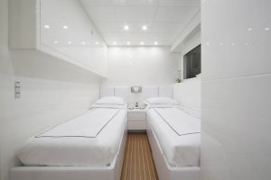 The FRIDAY motor yacht can accommodate up to 9 guests in 4 cabins including a Master, a VIP and Double and a Twin cabin with Pullman berth, each with ensuite facilities and the latest technology. All cabins also feature a TV, Hi-Fi and air-conditioning.