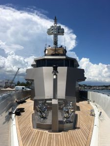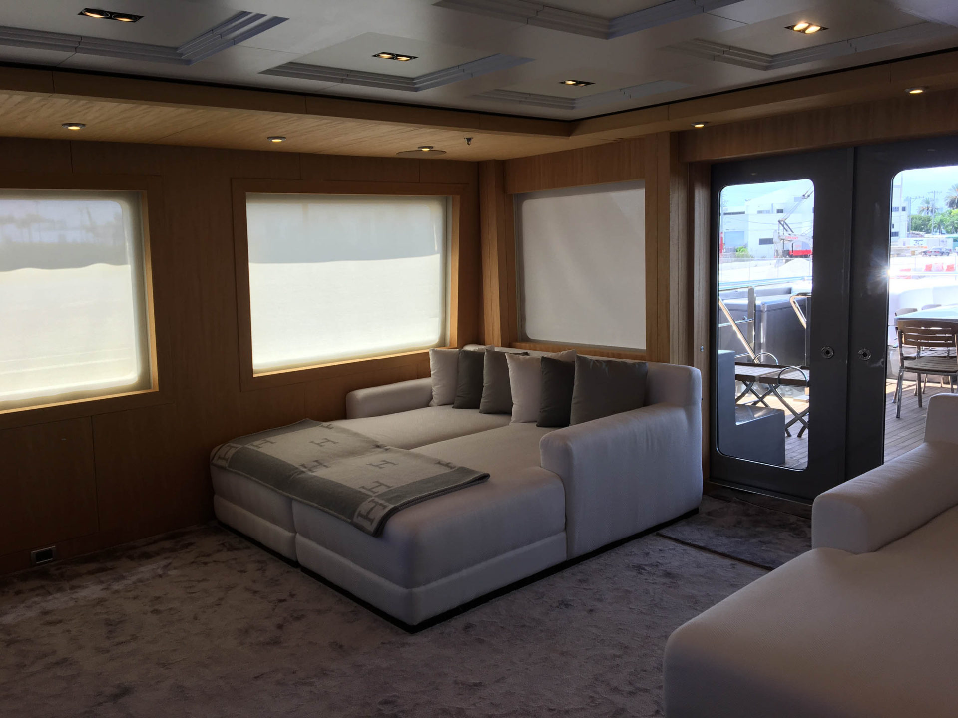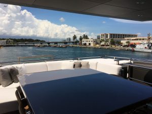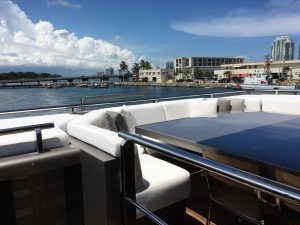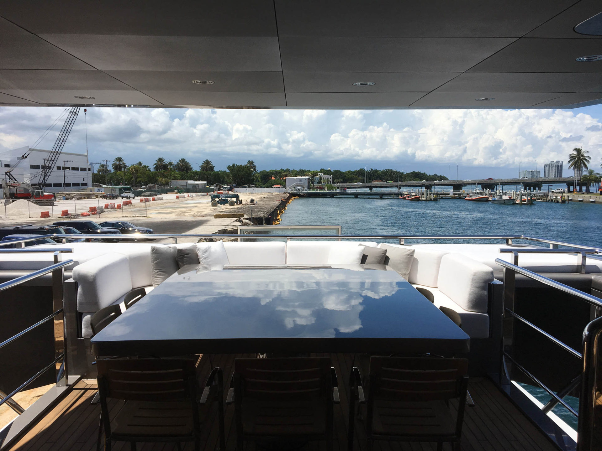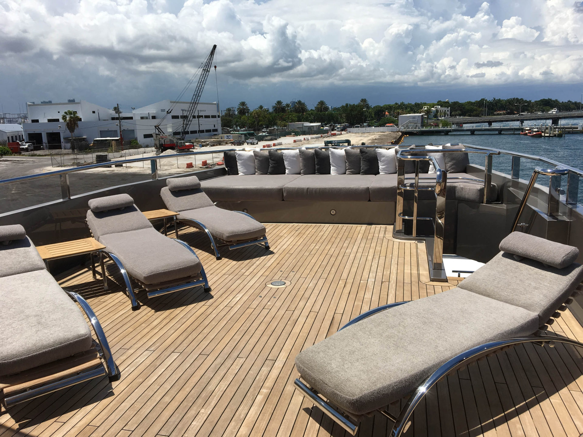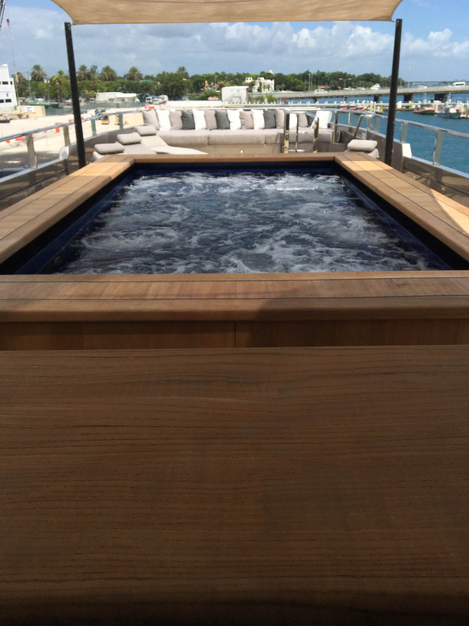 Originally built in Austrailia by OceanFast as “Sea Bowld” it was purchased by the current owner in 2011 and immediately underwent an enormous re-fit. The work was completed in Miami in 2016. She is now named “Mizu”. Part of the refit involved a new Jacuzzi tub on the fly-bridge, with space for 9-11 people. It also encompassed all interior trimmings; sofas, walls, bedding, and floor coverings.
