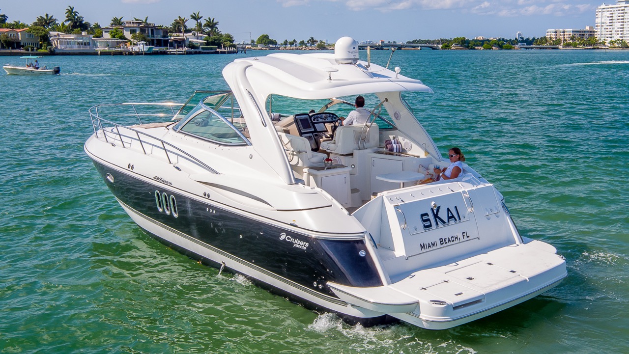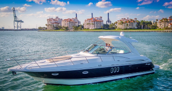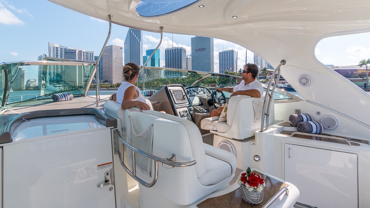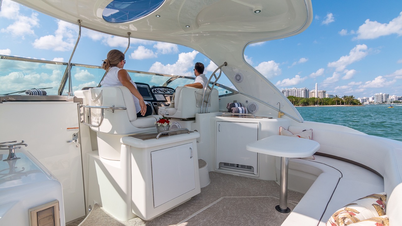 Our Cruiser is a late model Express with high ceilings, abundant salon space, one full bedroom and one complete bathroom. She has a hard top allowing everyone to gather in the shade for protection from the beautiful Miami heat. You can walk to the front of the boat where you will find cushions to lay on and sunbathe yourself while being pampered by our staff.