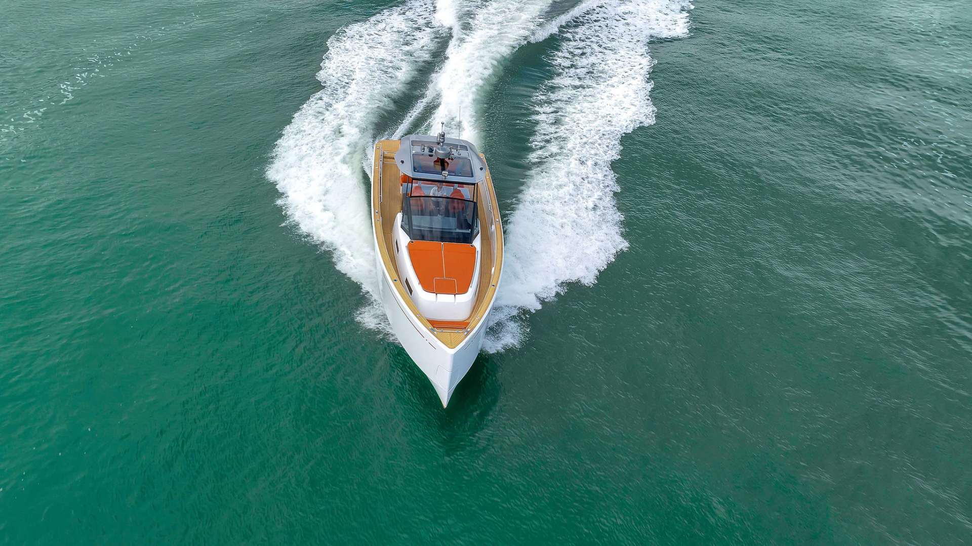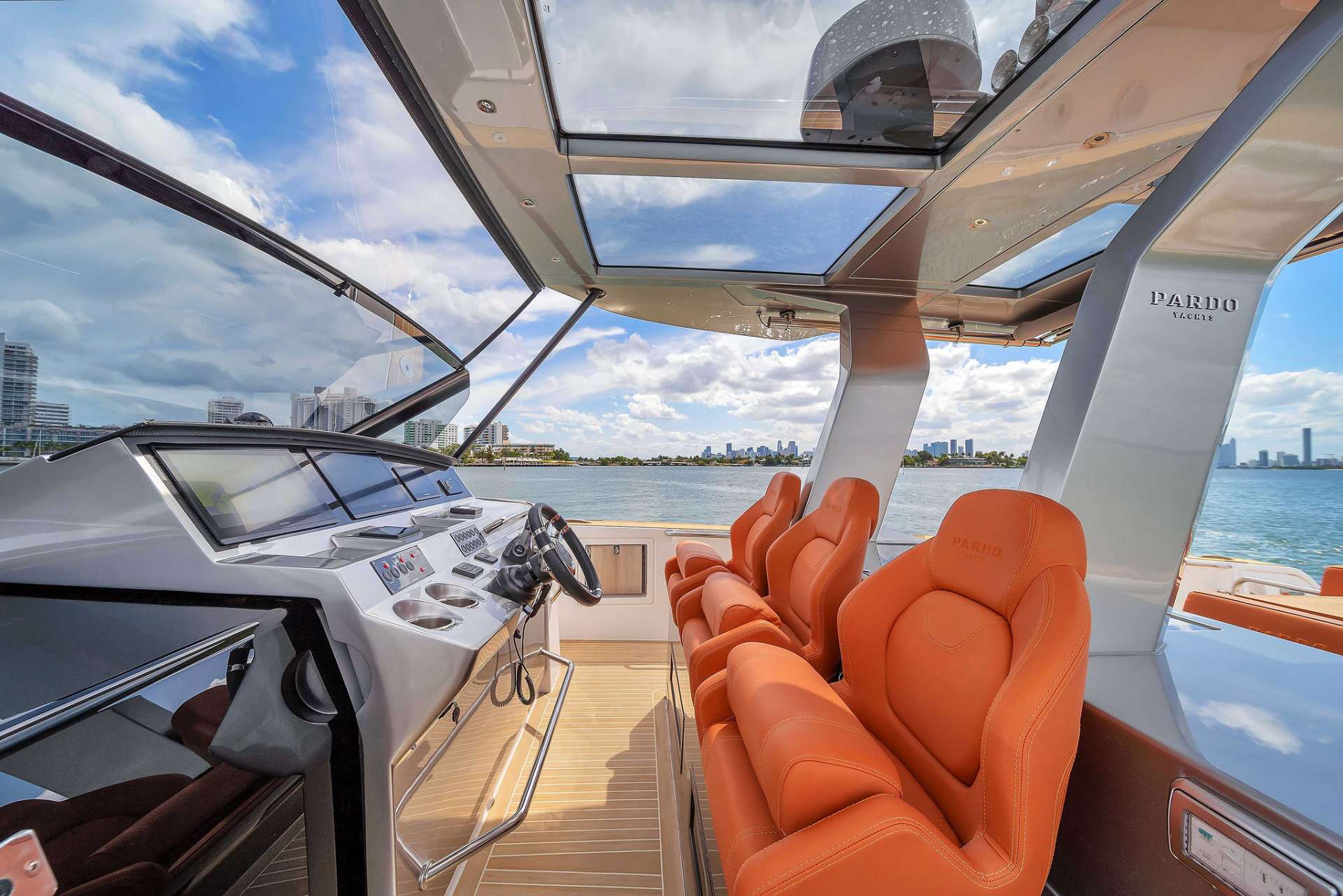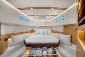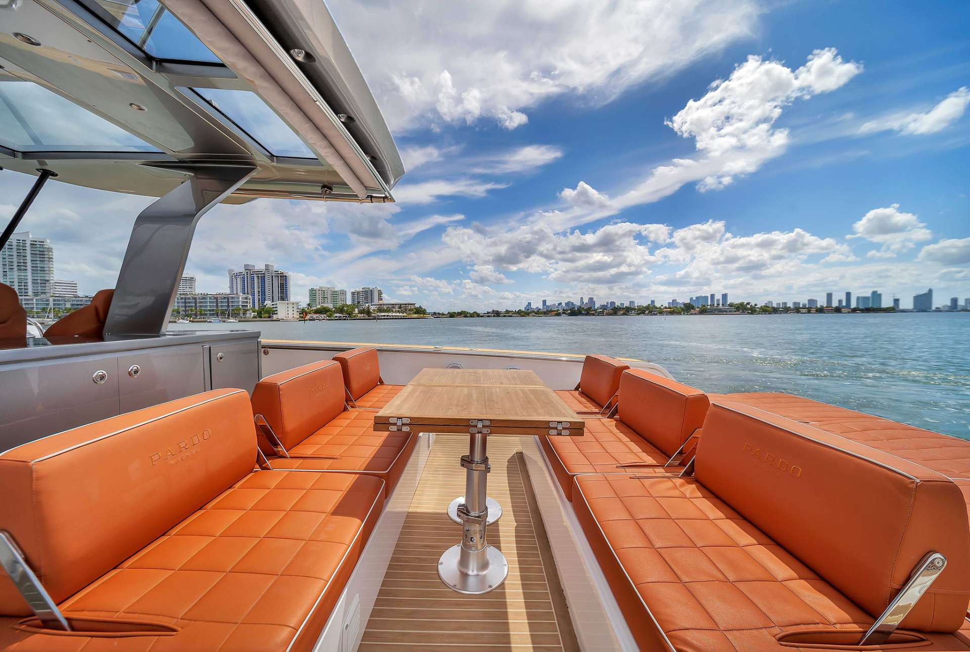The Pardo 43’s timeless elegance and unique personality are the result of both our boatbuilders’ expert hands and a unique design that showcases craftsmanship, even in the most modern shapes. Thanks to its linear and refined furnishings, the Pardo 43 interiors reflect the excellence synonymous with Made in Italy, characterized by a careful choice of wood veneers and meticulous workmanship. Excellent inside and out.