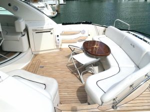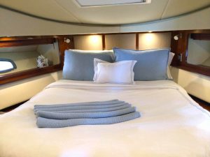 The new iteration of the Sundancer has evolved both inside and out. She is now standard with a V-drive which provides more room below and with her twin Mann 715-hp engines in our we recorded a best cruise speed of 20 knots giving her a range of 286 nautical miles with a 10% fuel reserve.