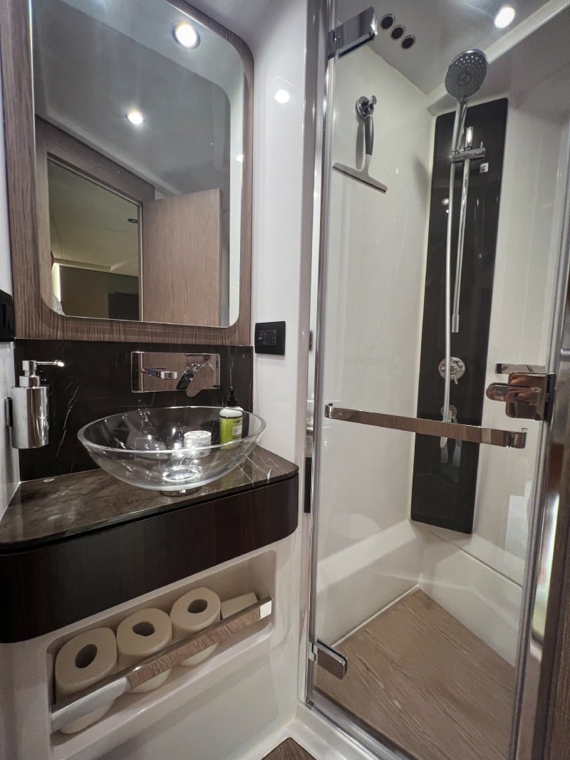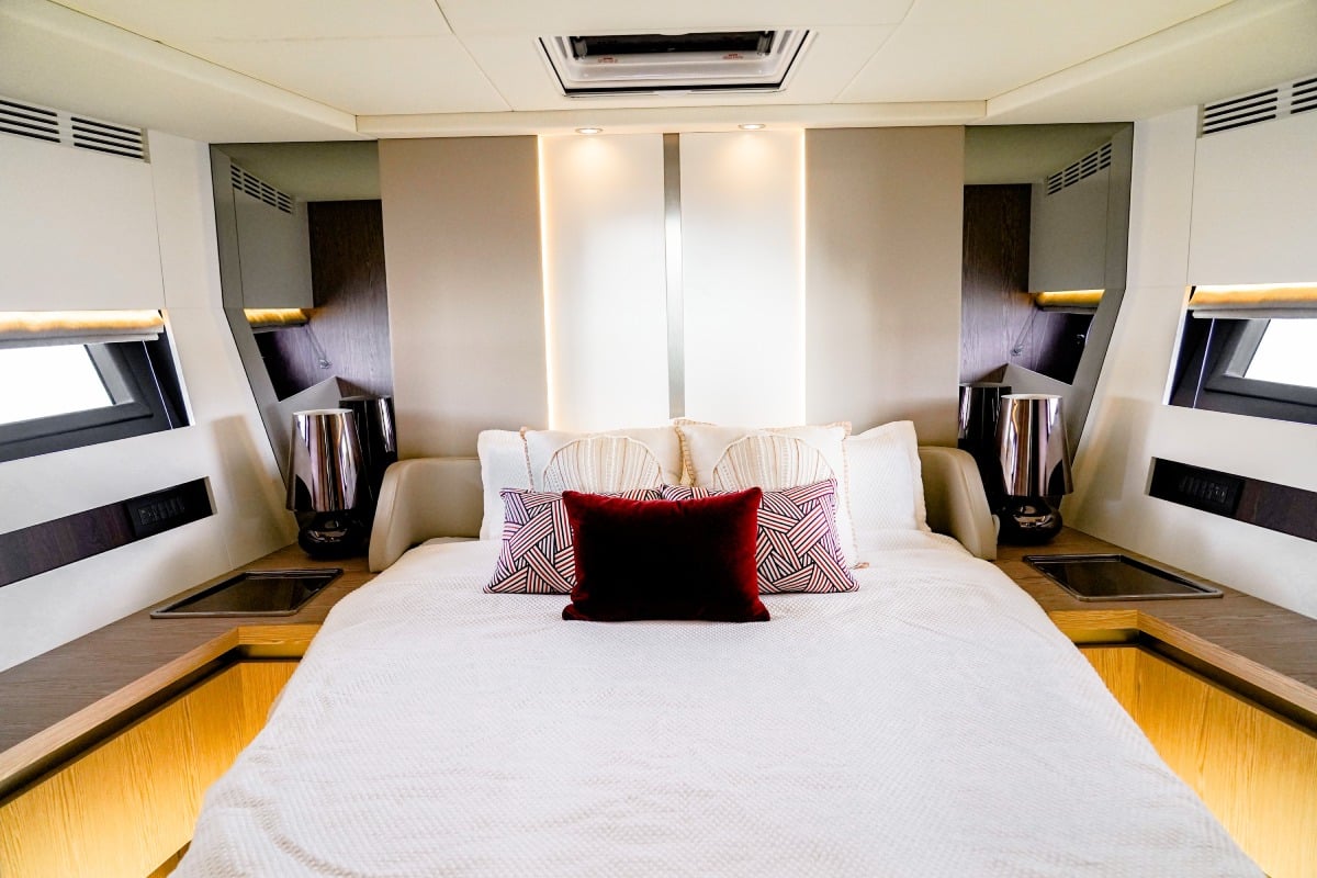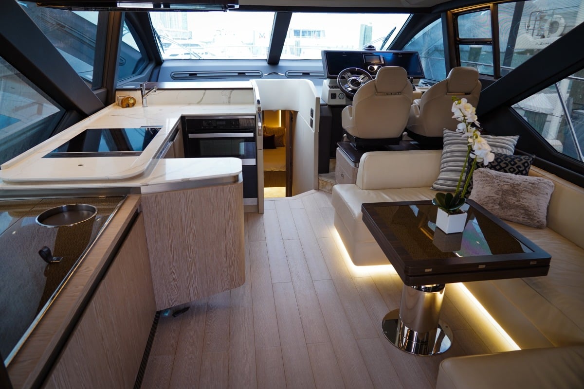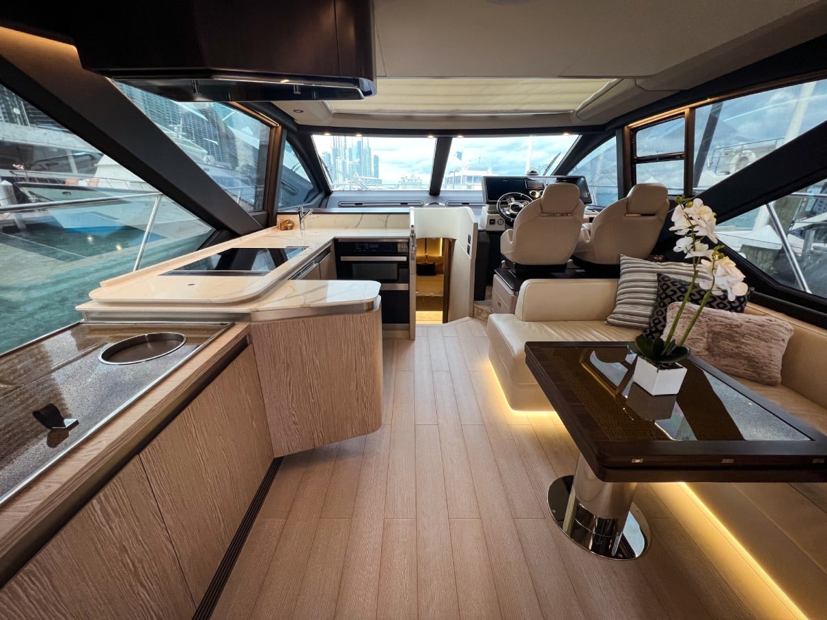In terms of amenities, she is loaded with top-of-the-line features that cater to every need. The yacht comes standard with a hydraulic swim platform, which makes it easy to access the water from the back of the boat. Television entertainment centers to watch your favorite sports team with premium sound system and Bluetooth.