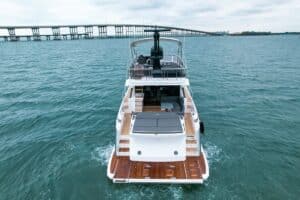The flybridge is topped with a hardtop that provides shade and protection from the elements, and the yacht is equipped with large windows that allow for plenty of natural light and stunning views of the surrounding waters.