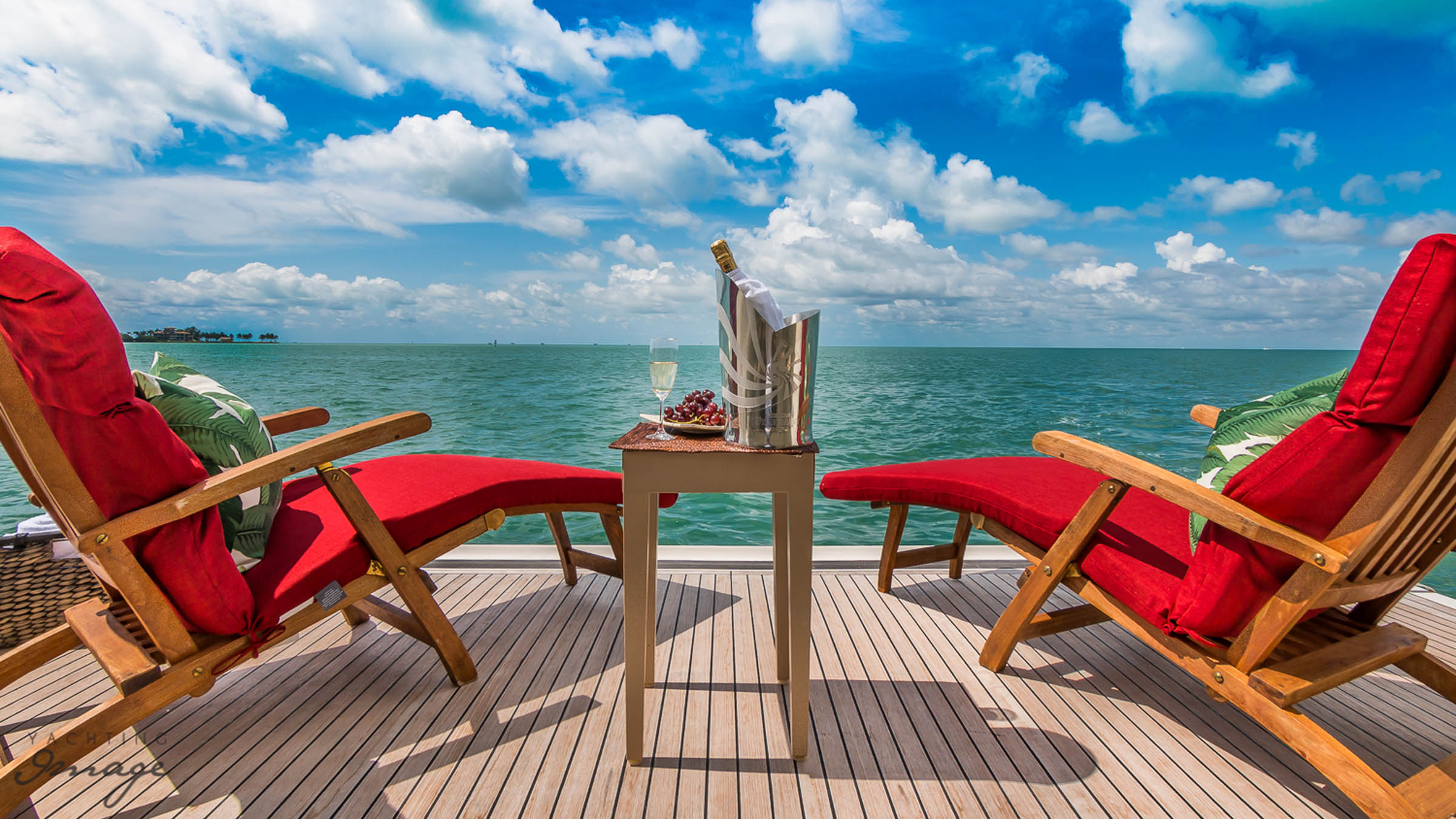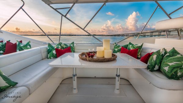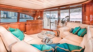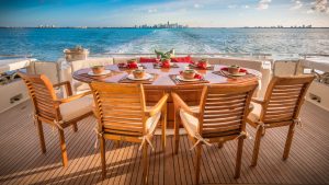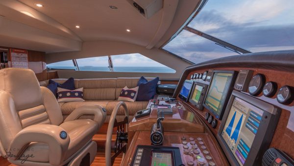 The vessel is entered from either a port or starboard boarding ladder aft – or the hydraulic passerelle to port where the wing docking station is located. The teak aft deck has permanent semi-curricular seating for 8 aft, facing forward with a varnished table and chairs with full lighting and stereo speakers. Access up to the flybridge and down to the swim platform and garage, is starboard. The engine room and garage can be accessed from the starboard side of aft deck. Moving forward alongside the decks – port or starboard – to the all teak foredeck, is a raised sun pad, dual anchor system and bosens locker to port and starboard. The foredeck is fully lighted with anchor locker, freeing ports and s/s cleats and hand rails.