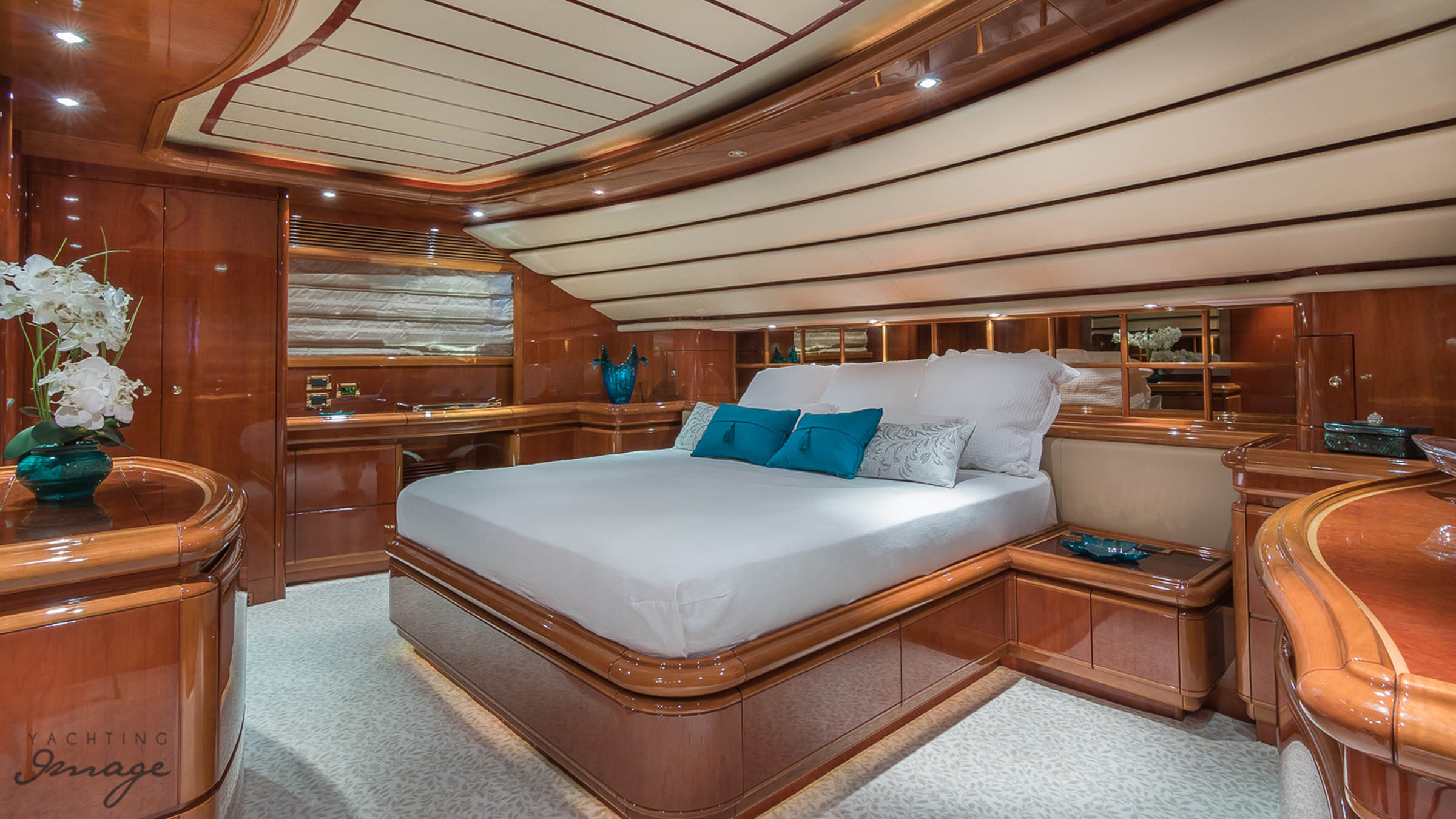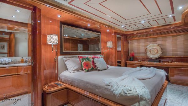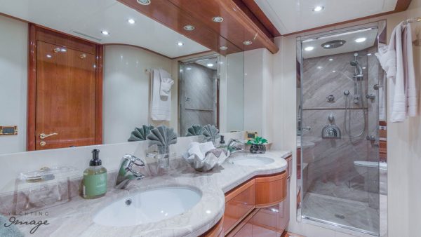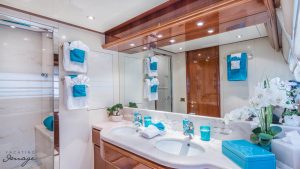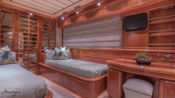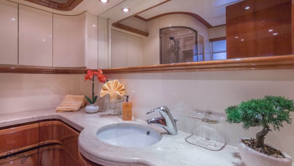 Furthest forward on main deck is the Master Suite with center line queen size berth (electric reclining head board), ensuite bathroom, ample closet & drawer space. Back to main salon and down stairs to three additional cabins. VIP Suite full beam, and aft with queen berth (also with electric reclining head board) and his & hers bathroom. Plenty of storage & closet space. The remaining two guest cabins are forward to port & starboard, both with twin berths (and singular Pullman berths) and ensuite bathrooms.
