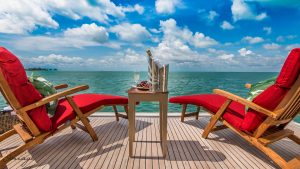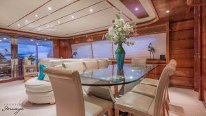 The garage is furthest aft and houses the wave runner and tender – the garage door is hydraulic electric. Outboard of the garage to starboard is hydraulic swim steps that extend into the water and raise flush up into the transom when not in use. Outboard to port is the hydraulic passarrelle. There is a built-in set of stairs that extend down from the aft deck to the swim platform & garage when the passarrelle is not in use.