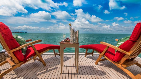 The crew quarters are below deck, furthest forward with a generous crew lounge and galley. The Captain’s cabin has a private head, and the crew cabin with stacked bunks for two has a separate head and shower.